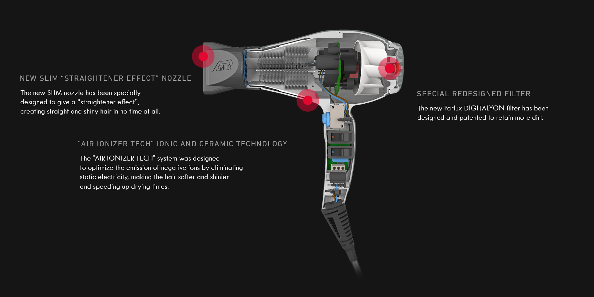 The new Parlux DIGITALYON® filter, as well as creating the hairdryer with an elegant and attractive design, has been designed and patented to trap more of the dirt that gets into the hairdryer, while keeping its power completely unalterated.
