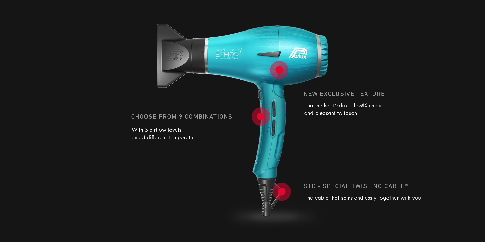 Thanks to its small diameter and pleasant, classic handle design, Parlux ETHOS®  offers impeccable ergonomics and balance, restoring the exceptional usability of traditional Parlux professional hairdryers.